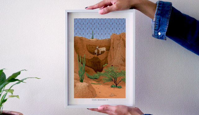 Ilustración inspirada en el paisaje del Laberinto del Cusco, ubicado en el Desierto de la Tatacoa, Huila, Colombia.